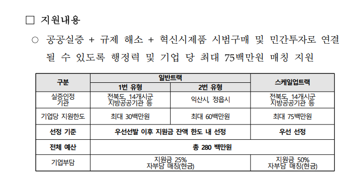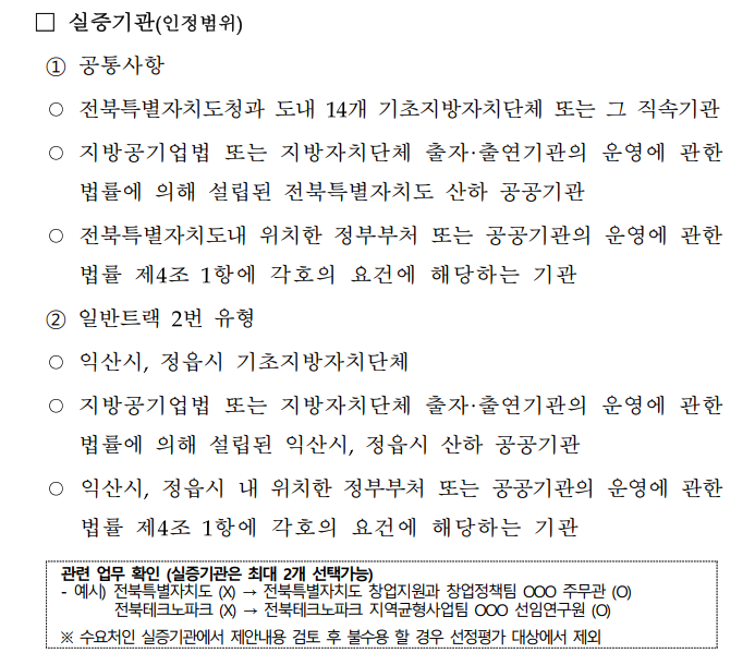 - (일반트랙 2번 유형) 공공분야에 적용될 수 있는 공공성과 혁신성을 가진 기술혁신 제품ㆍ서비스를보유한 익산시, 정읍시 소재 창업ㆍ벤처기업