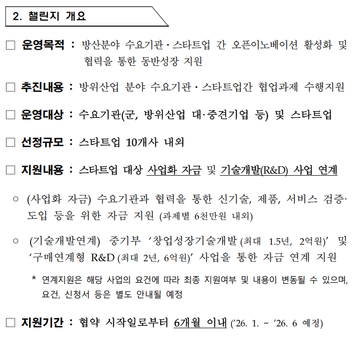 혁신 방위산업에 적용가능한 기술을 보유한 스타트업과 군·방산기업간 개방형 혁신을 지원하는「2025년 민관협력 오픈이노베이션 지원사업」방위산업 오픈이노베이션 챌린지에 참여할 스타트업을 모집합니다.