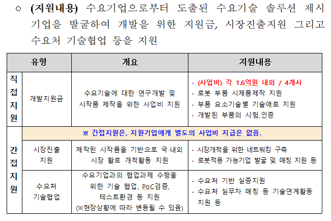 ☞ 수요기업으로부터 도출된 수요기술 솔루션 제시 기업을 발굴하여 개발을 위한 지원금, 시장진출지원 그리고 수요처 기술협업 등을 지원