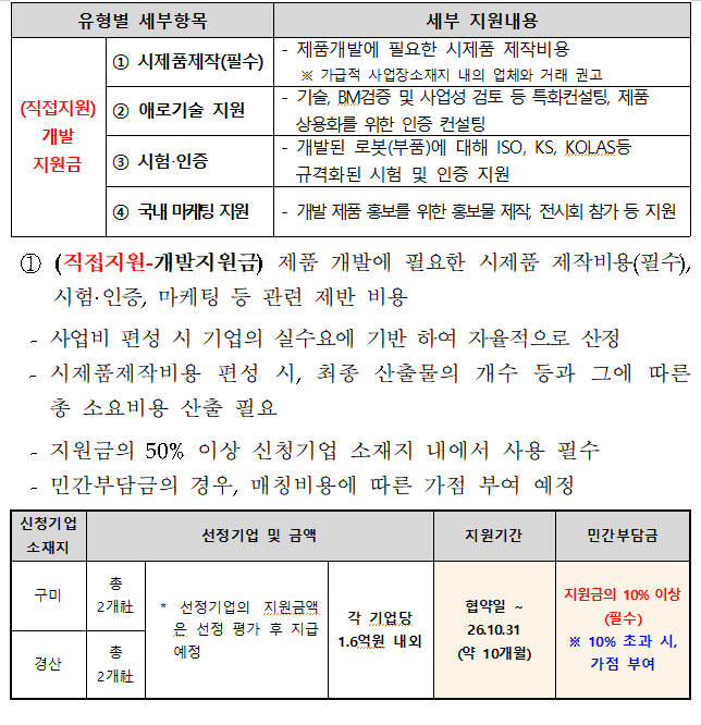 - 경북 구미시ㆍ경산시 內 사업장을 보유하고 있는 로봇분야 기업 및 신규 로봇사업을 추진하고자 하는 사업전환(확장) 목표 기업