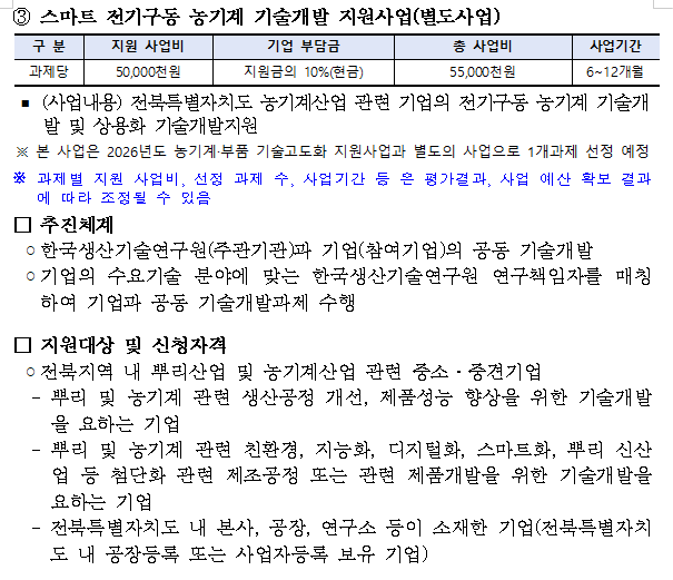 전북특별자치도 뿌리산업 및 농기계산업 관련 중소ㆍ중견기업의 기술고도화와 경쟁력 강화를 위하여「2026년도 농기계ㆍ부품 기술고도화 지원사업」(舊 전북 뿌리ㆍ농기계기술 고도화를 위한 인프라 활용 기술개발 지원사업) 을 다음과 같이 공고하오니, 전북도내 중소ㆍ중견기업은 사업 공고 안내에 따라 기술수요조사서를 제출하여 신청하시기 바랍니다.