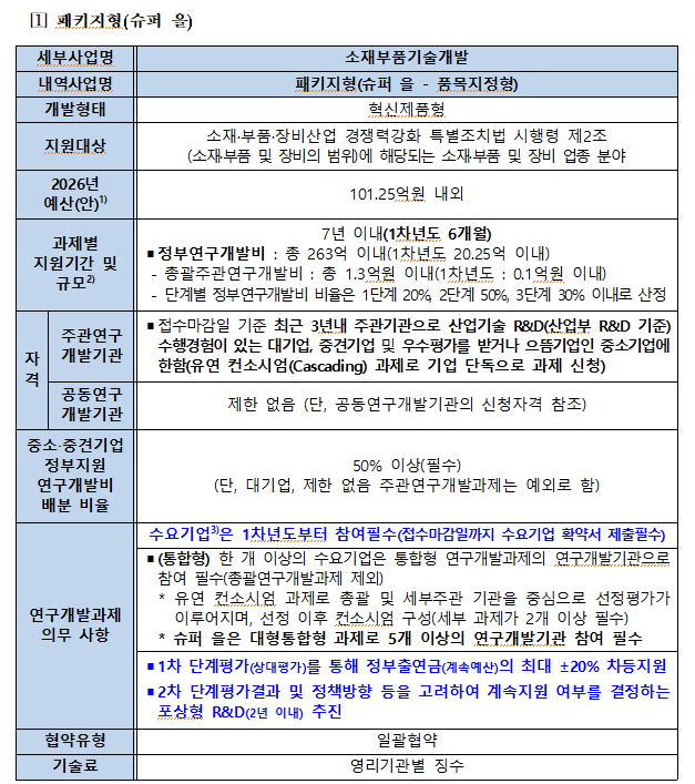 - 패키지형(슈퍼 을 - 품목지정형) : 정부연구개발비 총 263억 이내(1차년도 20.25억 이내)