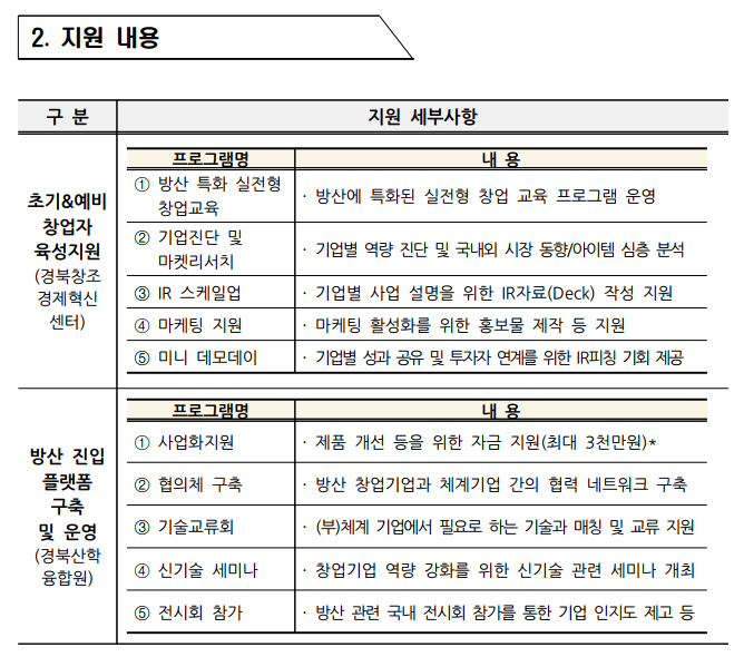 ☞ 사업화지원(최대 3천만원), 창업프로그램(교육, 마켓리서치, 마케팅), 방산 진입 플랫폼 구축 및 운영(사업화지원, 기술교류회, 세미나, 국내전시회참가) 등 지원