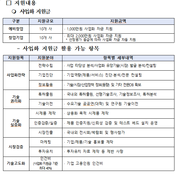 ☞ 사업화 지원금 (예비창업 1,000만원, 창업기업 최대 2,000만원) 및 창업 액셀러레이팅(교육, 멘토링 및 BM 컨설팅 등) 및 사업 고도화 지원