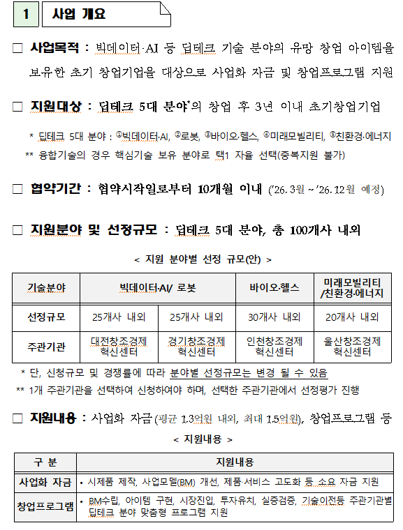 딥테크 기술을 보유한 초기 단계 창업기업의 사업 안정화와 성장을 지원하는『2026년도 초기창업패키지(딥테크 특화형)』에 참여할 창업기업을 다음과 같이 모집합니다.