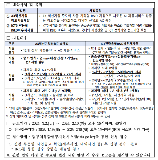 ☞ AX혁신기업창의기술개발(과제당 최대 6.475억원) 및 ICT전략융합R&D바우처지원 신규사업(과제당 최대 8억원) 지원