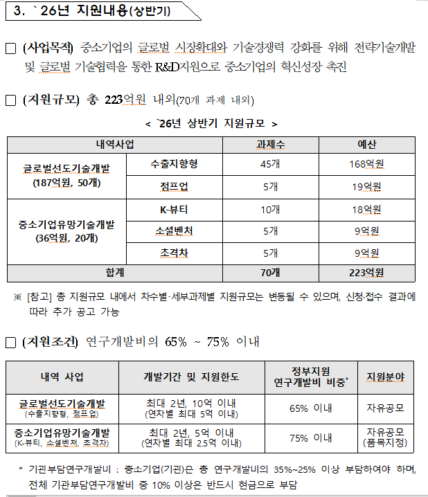 「2026년도 중소기업기술혁신개발사업」 상반기 시행 계획을 다음과 같이 공고하오니, 동 사업에 참여하고자 하는 중소기업은 사업안내에 따라 신청하시기 바랍니다.