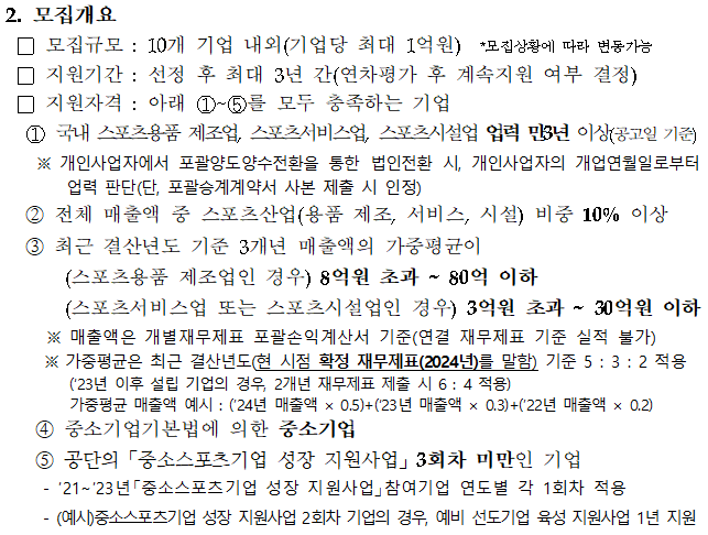 ☞ 국내 스포츠용품 제조업, 스포츠서비스업, 스포츠시설업 업력 만3년 이상(공고일 기준)