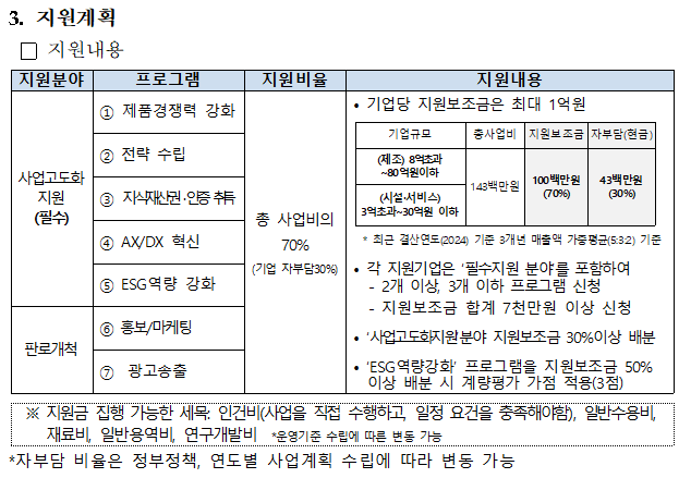 - 사업고도화 : 제품경쟁력 강화, 전략 수립, 지식재산권 ㆍ인증 취득, AX/DX 혁신, ESG역량 강화