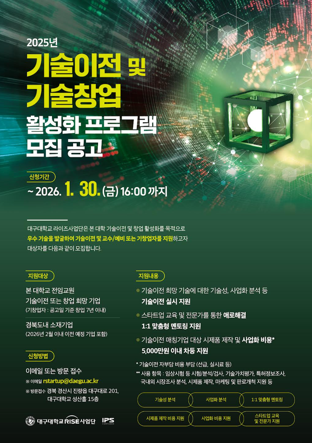 ☞ 기술이전 또는 창업 희망 기업(기창업자: 공고일 기준 창업 7년 이내), 경북도 내 소재기업(2026. 2월 이내 이전 예정기업 포함)