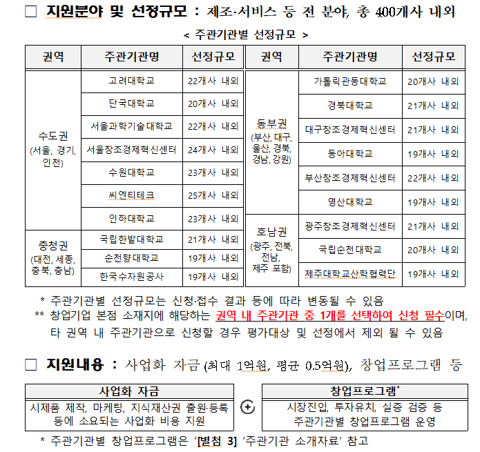 사업화자금 (평균 0.5억원 내외, 최대 1억원), 창업프로그램 등
