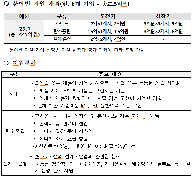 물산업을 육성하고 물기업의 성장을 견인하기 위한 소재ㆍ부품ㆍ장비 및 설계ㆍ운영 분야의 기술개발에서 사업화까지 전주기 지원을 위해 아래와 같이 공고하오니 참여를 희망하는 물기업은 2026. 2. 19.(목) 16:00까지 신청하여 주시기 바랍니다.