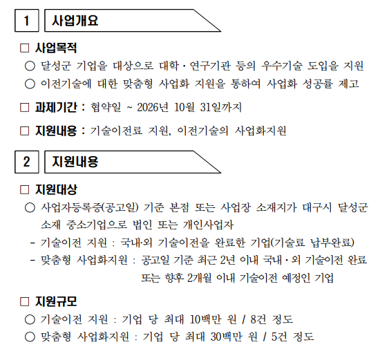 대구시 달성군과 대구테크노파크에서는 달성군 기업을 대상으로 기술이전 및 기술사업화 지원을 위한 「신산업 기술이전 및 사업화 지원사업」의 참여기업 모집을 아래와 같이 공고하오니 많은 참여 바랍니다.