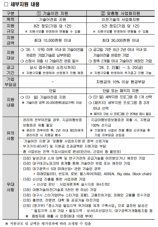 - 맞춤형 사업화지원 : 공고일 기준 최근 2년 이내 국내ㆍ외 기술이전 완료 또는 향후 2개월 이내 기술이전 예정인 기업