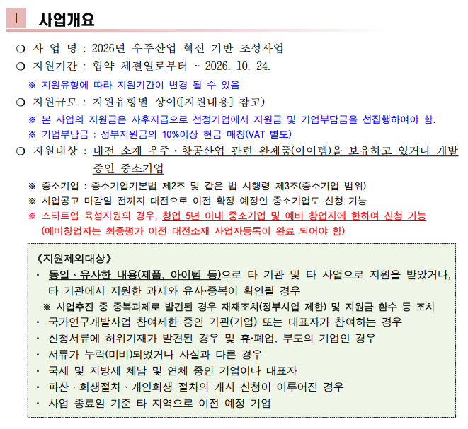 대전광역시「2026년 우주산업 혁신 기반 조성사업」의 주관기관인 대전테크노파크에서는지역 내 우주산업의 선도적 혁신기반 조성과 우주 기업 육성을 통한 신산업 창출 및 일자리 증대를 위하여 관련 기업을 대상으로 아래와 같이 지원대상을 모집 하고자 합니다.