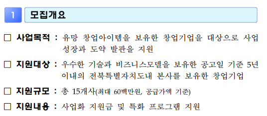 ☞ 우수한 기술과 비즈니스 모델을 보유한 공고일 기준 5년 이내의 전북특별자치도내 본사를 보유한 창업기업