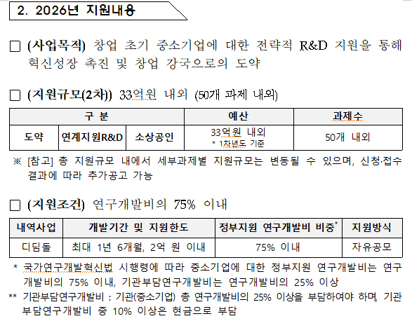 「2026년도 창업성장기술개발사업(디딤돌)」 제2차 시행계획을 다음과 같이 공고하오니, 동 사업에 참여하고자 하는 중소기업은 안내에 따라 신청하시기 바랍니다.