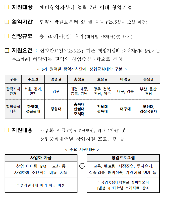 2026년도 창업중심대학 지역기반 (예비)창업기업 모집공고