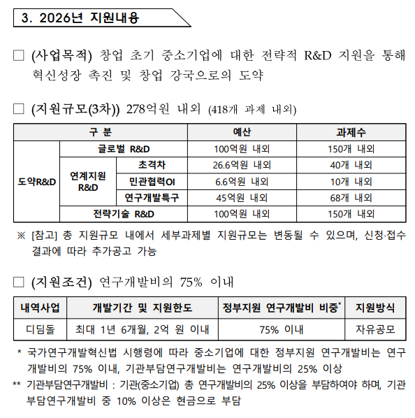 「2026년도 창업성장기술개발사업(디딤돌)」 제3차 시행계획을 다음과 같이 공고하오니, 동 사업에 참여하고자 하는 중소기업은 안내에 따라 신청하시기 바랍니다.